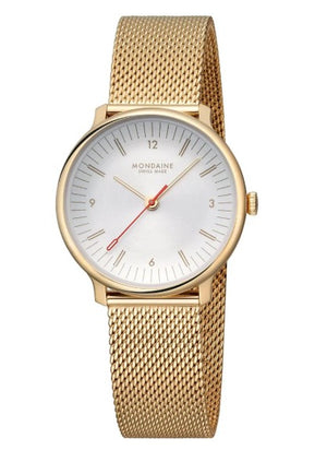 In dieser 33 mm Doppio Uhr harmoniert Vintage-Charme mit schlichtem Minimalismus. Sie zeichnet sich durch ein konkav gewölbtes grau-weisses Zifferblatt in kreisförmig brossiertem Schliff aus, das mit einem doppelt gewölbten Saphirglas versehen ist. Diese Kombination sorgt für ein beeindruckendes Spiel von Licht und Tiefe. Das Design spielt mit dem Konzept der Dualität durch die Doppellinien auf den Zeigern und Indexen sowie auf der Spitze des Sekundenzeigers. Die rote Farbe des Sekundenzeigers stellt eine Verbindung zur ikonischen MONDAINE Official Swiss Railways Kollektion her. Auf dem Gehäuseboden ist das originale MONDAINE-Logo von 1951 eingraviert, das das reiche Erbe der Marke würdigt. Die Uhr wird von einem Schweizer Quarzwerk angetrieben und das Datumsfenster und die Wasserdichtigkeit bis zu 5 ATM verleihen dem Zeitmesser weitere, praktische Funktionalität.