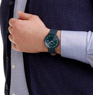 In dieser 41 mm Doppio Uhr harmoniert Vintage-Charme mit schlichtem Minimalismus. Sie zeichnet sich durch ein konkav gewölbtes schwarzes Zifferblatt in kreisförmig brossiertem Schliff aus, das mit einem doppelt gewölbten Saphirglas versehen ist. Diese Kombination sorgt für ein beeindruckendes Spiel von Licht und Tiefe. Das Design spielt mit dem Konzept der Dualität durch die Doppellinien auf den Zeigern und Indexen sowie auf der Spitze des Sekundenzeigers. Die rote Farbe des Sekundenzeigers stellt eine Verbindung zur ikonischen MONDAINE Official Swiss Railways Kollektion her. Auf dem Gehäuseboden ist das originale MONDAINE-Logo von 1951 eingraviert, das das reiche Erbe der Marke würdigt. Die Uhr wird von einem Schweizer Quarzwerk angetrieben und das Datumsfenster und die Wasserdichtigkeit bis zu 5 ATM verleihen dem Zeitmesser weitere, praktische Funktionalität.