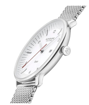 Diese Uhr verbindet zeitloses Schweizer Design mit zukunftsweisender Innovation. Das 41 mm Gehäuse ist aus 316L-Edelstahl mit bis zu 91 % Recyclinganteil gefertigt und wird von einem innovativen Solaruhrwerk angetrieben. Unter dem Zifferblatt befinden sich Solarzellen, die sowohl natürliches als auch künstliches Licht nutzen und die Energie in einer wiederaufladbaren Batterie speichern. Diese gespeicherte Energie versorgt die Uhr mit Strom, wodurch ein regelmäßiger Batteriewechsel überflüssig wird und eine umweltfreundliche Zeitmessung möglich ist. Eine voll aufgeladene Batterie kann die Uhr etwa 8 Monate lang mit Energie versorgen, auch ohne zusätzliche Lichteinwirkung.